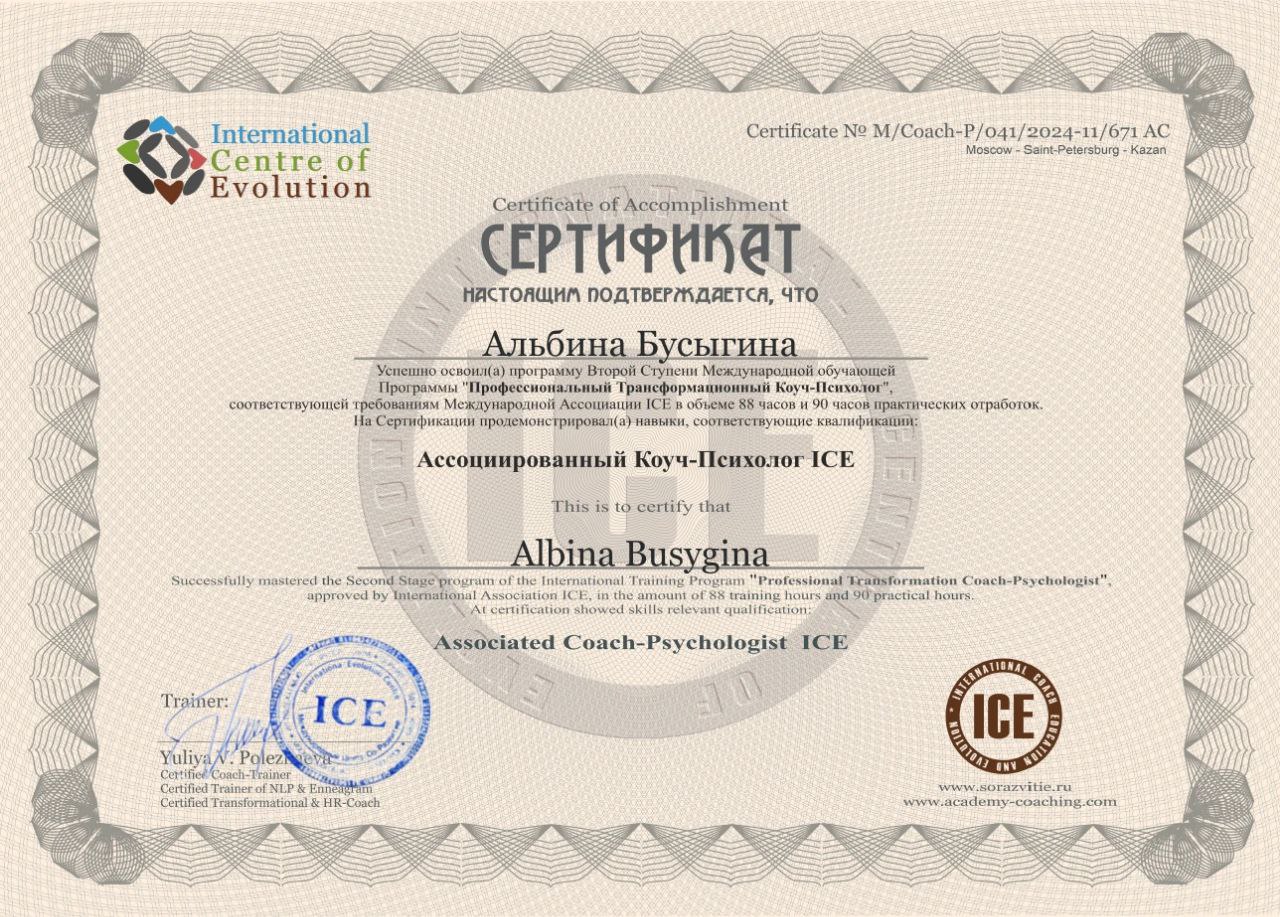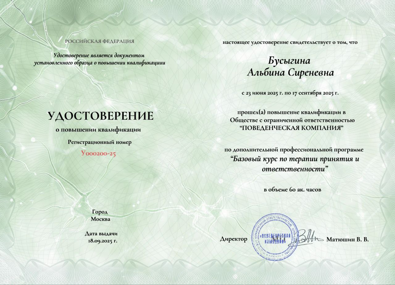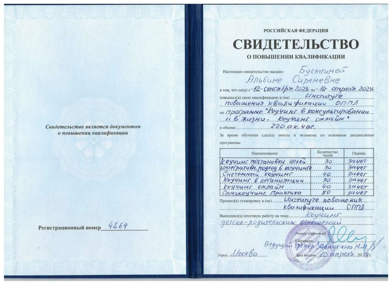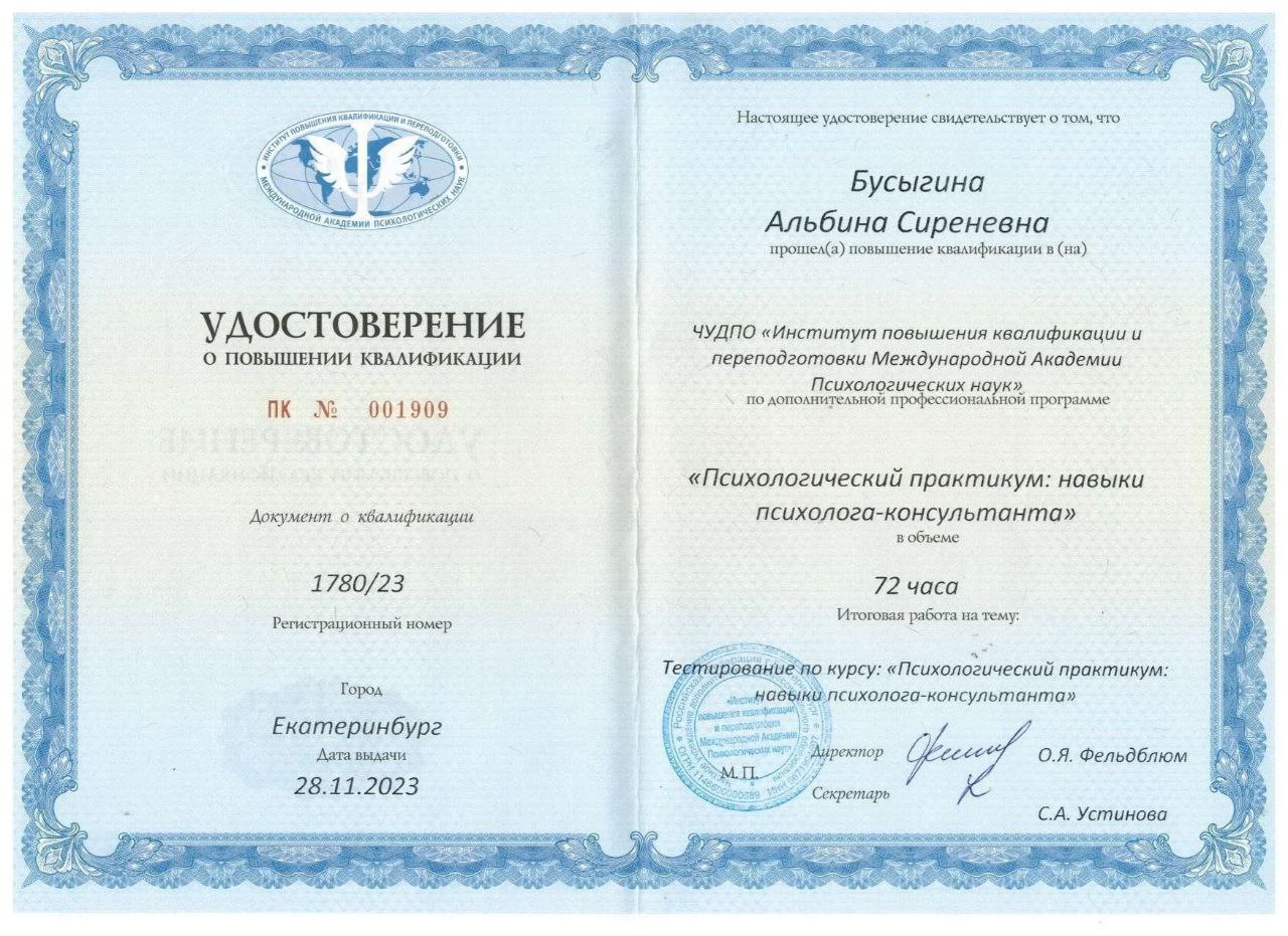 В 2023 году повышение квалификации "Психологический практикум: навыки психолога-консультанта", г. Екатеринбург