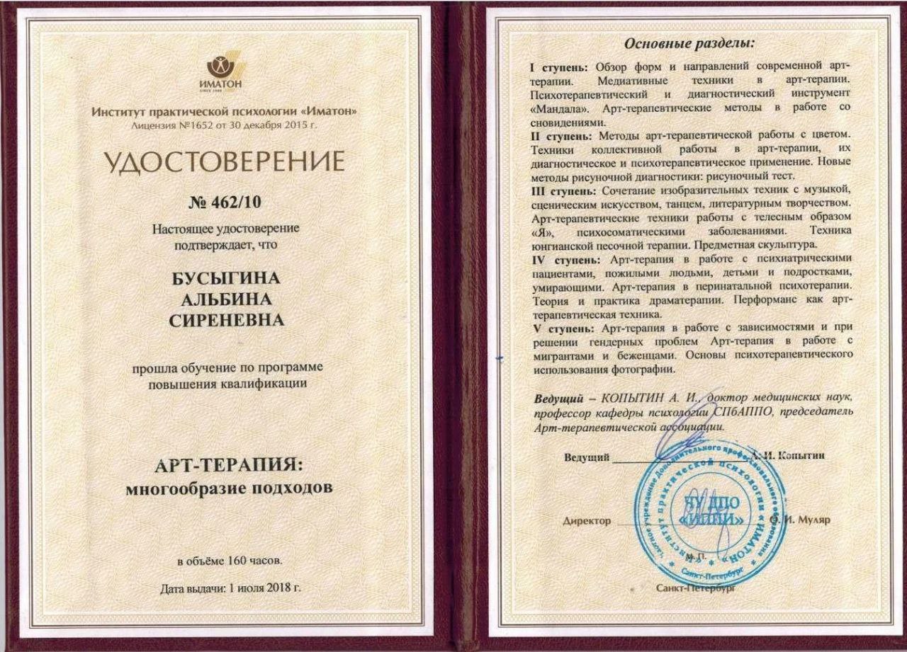 В 2017 году повышение квалификации, "Арт-терапия:многообразие подходов", Институт практической психологии "Иматон", г. Санкт-Петербург