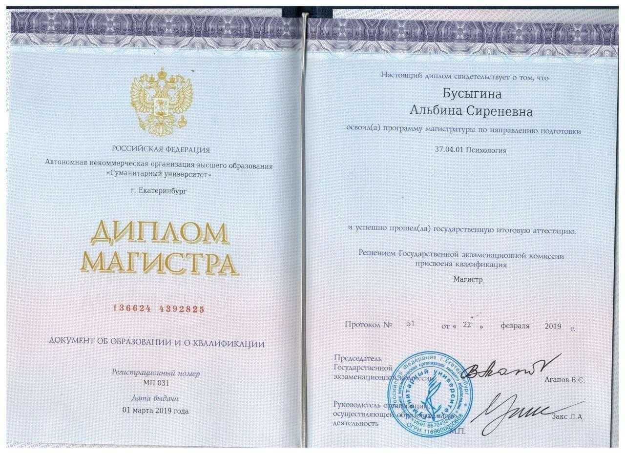 В 2019 году Магистр "Психология", Гуманитарный университет. г. Екатеринбург