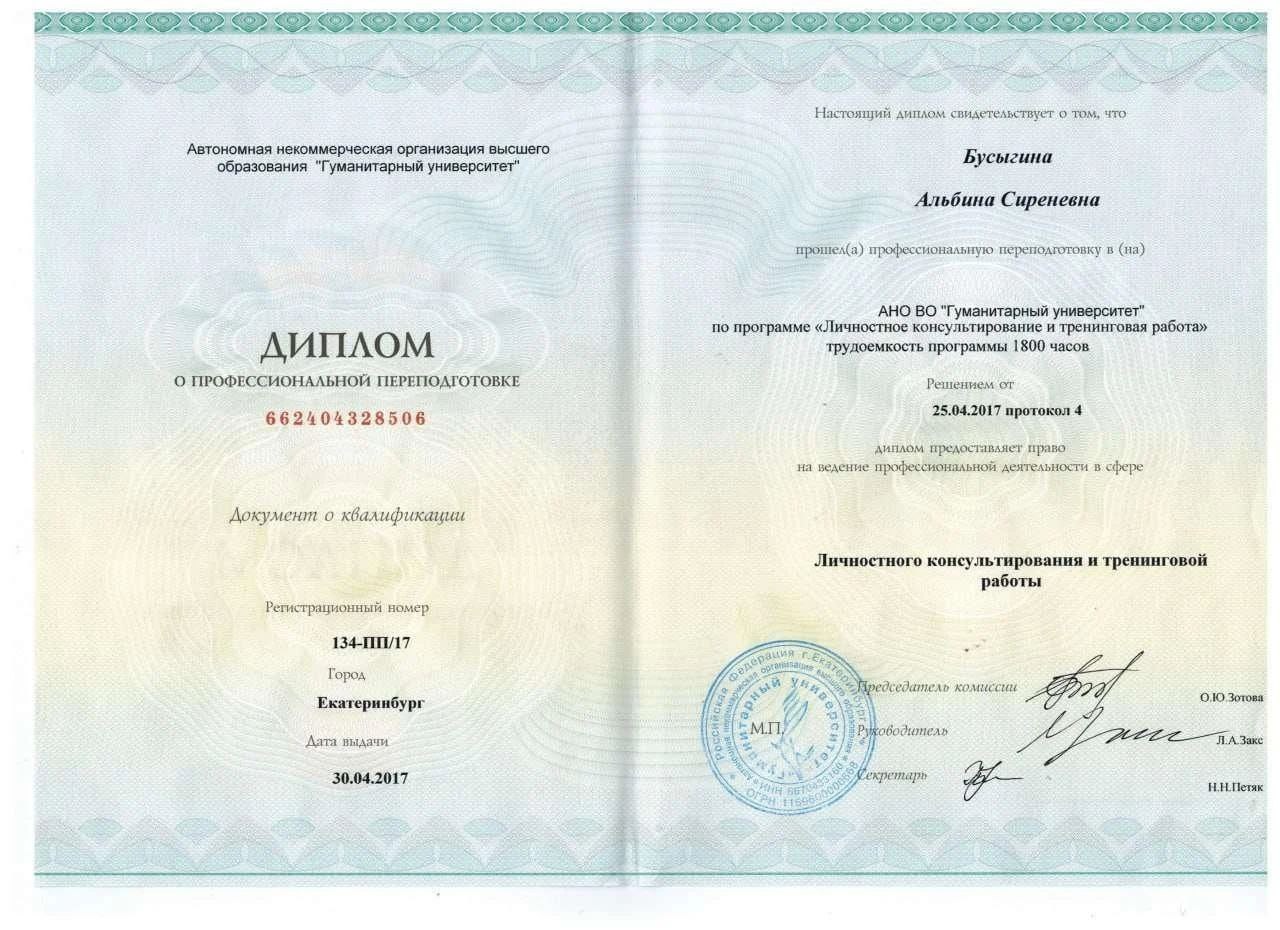 В 2017 году Профпереподготовка "Личностное консультирование и тренинговая работа", Гуманитарный университет, г. Екатеринбург